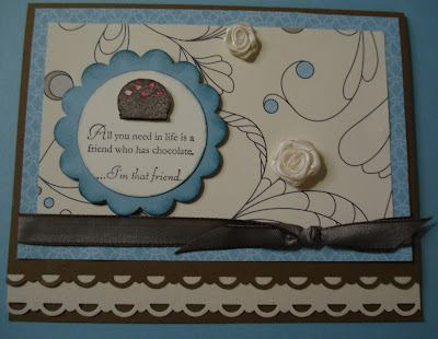 I cut my base card from soft suede and of course I cut it a little short (I must have meant to do that, cause it was a happy mistake!) so I used my scallop edged punch and punched the end of the soft suede all the way across, added another punched strip of very vanilla.   The designer paper layers are from the Elegant Soiree paper pack (love it).   I used my ex-large scallop punch to punch out the scalloped circle in Baja Breeze, sponged the edges of it with baja ink.  I stamped my saying on very vanilla with Early Expresso ink twice, cut one out with my 1.75″ circle punch, cut out the chocolate candy on the other one and using dimensionals, popped it up, colored in the hearts with my poppy parade marker and used Smooch Pearlized Top Coat to make it shiny(ah, bling) added a few of SU’s new satin roses to the DSP and a strip of satin Early Expresso taffeta ribbon.  Has anyone noticed that the Early Expresso taffeta looks just like our favorite retired Chocolate Chip taffeta ribbon???   Okay, maybe not exactly, but very, very close to it!   Anyway, that makes me HAPPY!