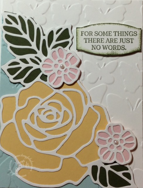 I am so happy I have the Rose Wonder Bundle!  I just love all the possibilites with this bundle!   Here I have simply used the die cut  to make the white outline and added colored  cardstock to the back of it!  I used the Fluttering embossing folder on the background.  The saying is also from this bundle.  I will never use it again with out thinking of plastic pink flamingos! Here are the materials used to make this card!