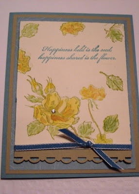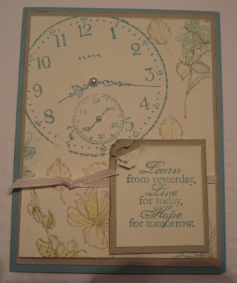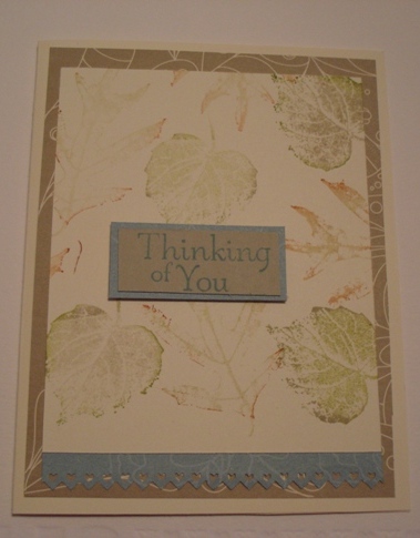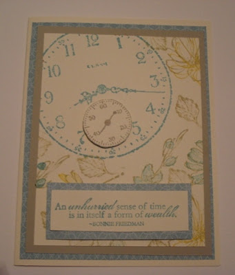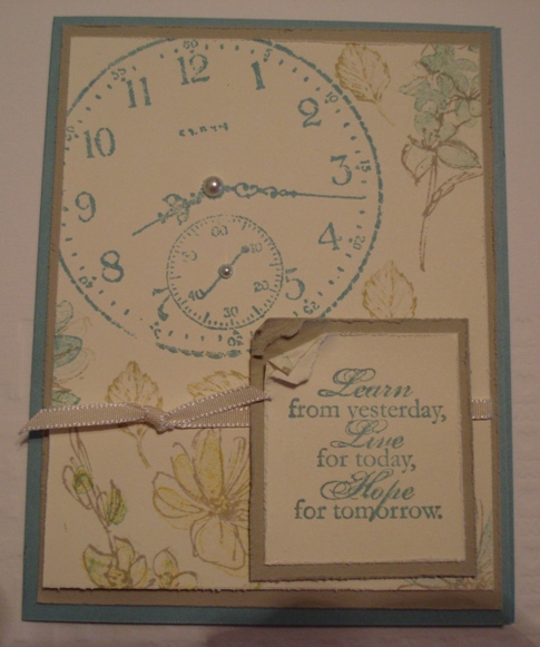 WHY are the holidays so stressful? My husband and I had to go out of town for a few days to take care of some family things. Last time, I didn’t take any Stampin’ Up products with me and I was so miserable! Now, those of you who stamp with me, know that I stamp everyday, whether I need to or not. This time I brought a few stamps and my CLASSIC STAMPIN’ SPOTS and I’ve been having a blast.. Stamping spots are like tiny stamp pads (check them out on pg 194 of the cataglog) and you can take all the colors with you! They are also fabulous to get started with when you are a new stamper or just stamping on the go! The best thing about spots are when your hubby says “you’re not going to take all that stuff with you again, are you?”, you can honestly say, of course not just 2 small bags, I promise! Here are the cards I’ve made so far using two of my favorite stamp sets, SENSE of TIME (pg. 127; #113804, $22.95) , HAPPINESS SHARED (pg. 100; #120534, $12.95) and French Foliage from the Holiday Mini (pg. 14; #121166, $14.95) .