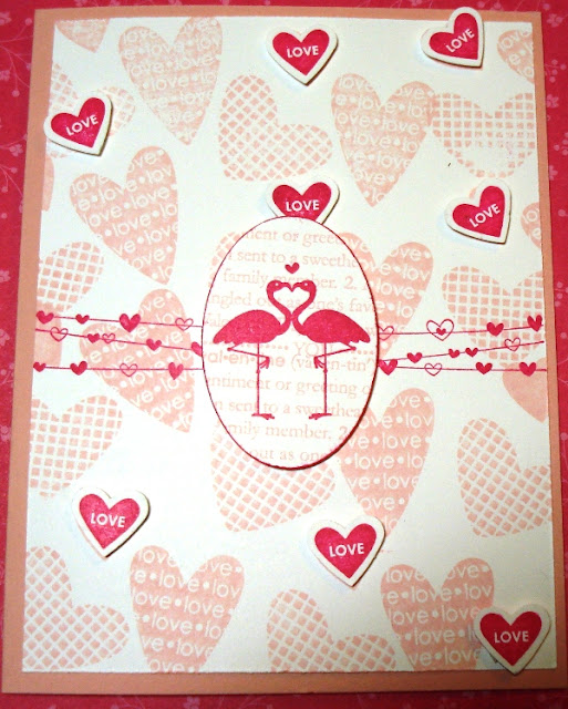 It is cold and icy here, what a great day to stamp! I just had to share another card with you that I made with my new Valentine defined stamp set! I stamped the background of hearts with the I {Heart} Hearts stamp set (#118571). I used blushing bride and whisper white card stock with blushing bride and Melon mambo inks, the wide oval and mini heart punches. I’m iced in and stampin’ the day away. Who could ask for more?