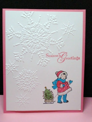 Todays’ PINK and fabulous card is from the Greeting Card Kids stamp set (120633) you might want to put this on your wishlist. I used Regal Rose card stock and ink and the Snowflake embossing folder. I can’t believe I forgot how very cool Regal Rose card stock and ink was…..so sorry but my new favorite is, yes, you guessed it, REGAL ROSE. Lucky for you, I only had 4 sheets of it or I’m sure the next 3 cards I post would be REGAL ROSE! I just love this card, even if I did make it!