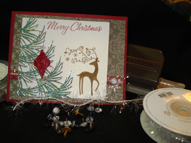 My last card used, Cherry Cobbler card stock for the base, Deck the Halls dsp, and then whisper white paper. Stamps used were Dasher & Tree trimings , the tree was made with the palm leaf stamp from the retired **Tropical Party** set from the summer mini, Garden geen craft ink and Iridescent embossing powder, Tinsel clear trim and glitter brads.