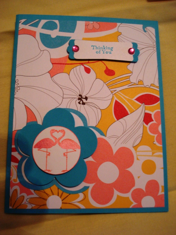 I used Tempting turquoise card stock, added a layer with my cherished paper, added a turquoise flower using the Fancy Flower extra large punch, #118073, pg 200, stamped the flamingos in pretty in pink, and then I used Smooch Pearlized accent ink #119969, pg 195 to make the flamingos all shiny and blingy, added a Thinking of you saying and two sparkly glitter brads (also pink). WOW! FABULOUS! If if I do say so myself!