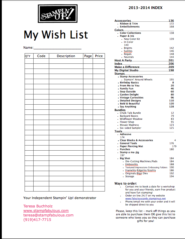 So lets get started on your list! Click on the side bar, browse the current catalog and the holiday mini catalog! If you would like a catalog please email me and I will send you a free copy! Fill in your wish list, and send it to your selected loved ones and friends. Do not be afraid to give a copy to your children to give to your hubby, mom, sister, or brother. Seriously, this works, I have even tied it around the cats collar. I started this before I joined the stampin’ up sisterhood, and one year my hubby was able to get me a level 2 hostess set that I really wanted. I never asked him how he worked out that deal with my demonstrator, I just said thank you very much and off to stamp I went.