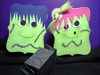 I am so excited! I can hardly wait for tomorrow nights SO, YOU THINK YOU’RE A BIG SHOT workshop! This is the 1st Big Shot workshop I’ve done and it is going to be spooky & fabulous! I’m gonna share a sneak peak of 2 of the projects will be making tomorrow night! Laura is hosting this event in my stamp room, everyone is invited so if you want to come please RSVP to fabulouscards@gmail.com. Mr. & Mrs. Frankenstein are attached to a box that you can fill with treats and the candy wrapper is also filled with candy! Hope to see you tomorrow! Don’t tell Laura, I post a sneak peak!